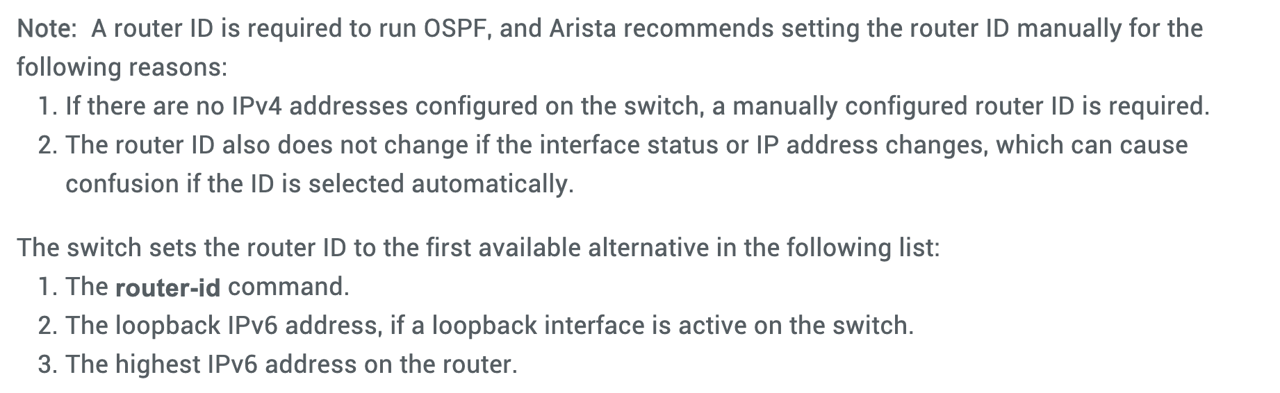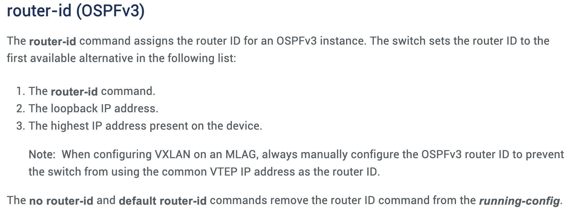 - When you remove a router-id from an OSPFv3 process, Arista EOS does not complain even when the device has no IPv4 addresses (in that VRF).