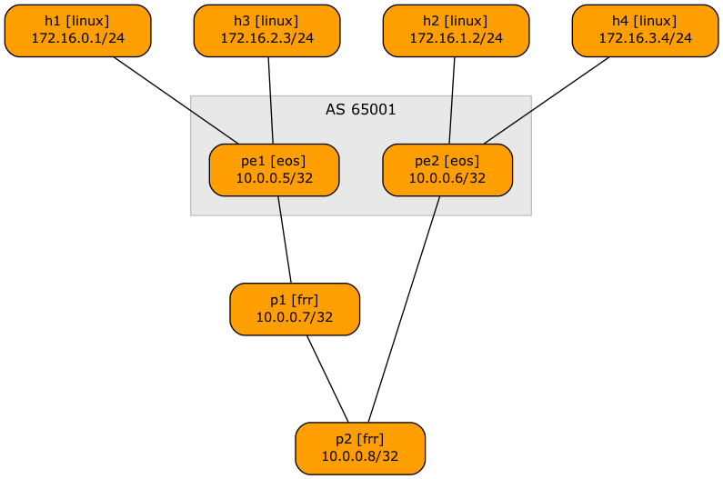 Someone recently asked me whether it’s possible to use netlab to build an MPLS/VPN (technically, BGP/MPLS IP VPN) lab with SR-MPLS core. Of course, let’s build a simple lab using Arista EOS and Linux containers to implement this topology:
